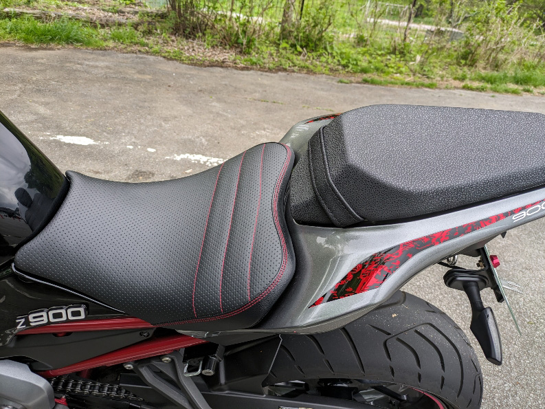 なにか、人と違うカスタムがしたかったこと、座面が前下がりで足が疲れる事より加工をお願いすることにしました。 見た目では赤いアクセントを入れたくて、縫い糸を赤にダブルステッチで、個性を出すため座面後ろにタックロールを3本入れました。 座面加工は、足つきをスポイルしたくなかったので、できるだけ後方を削ってフラットに近づけ、座面が薄くなった分ゲルパッドで補いました。 1000キロほど走りましたが、疲れにくくなった気がします。 仕上がりが美しく、特に普段は見えない裏側の処理が丁寧で感動しました。 ありがとうございました。